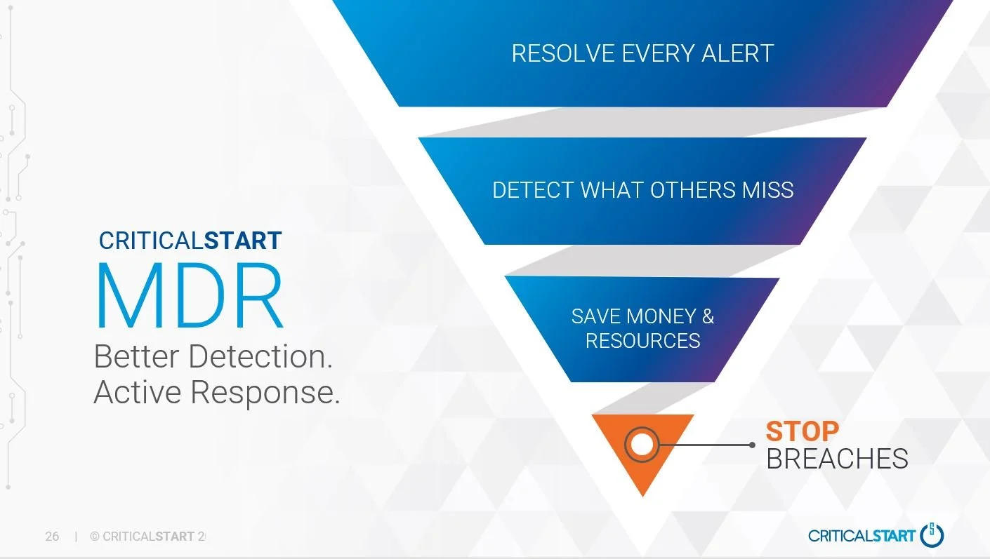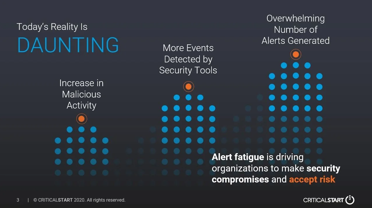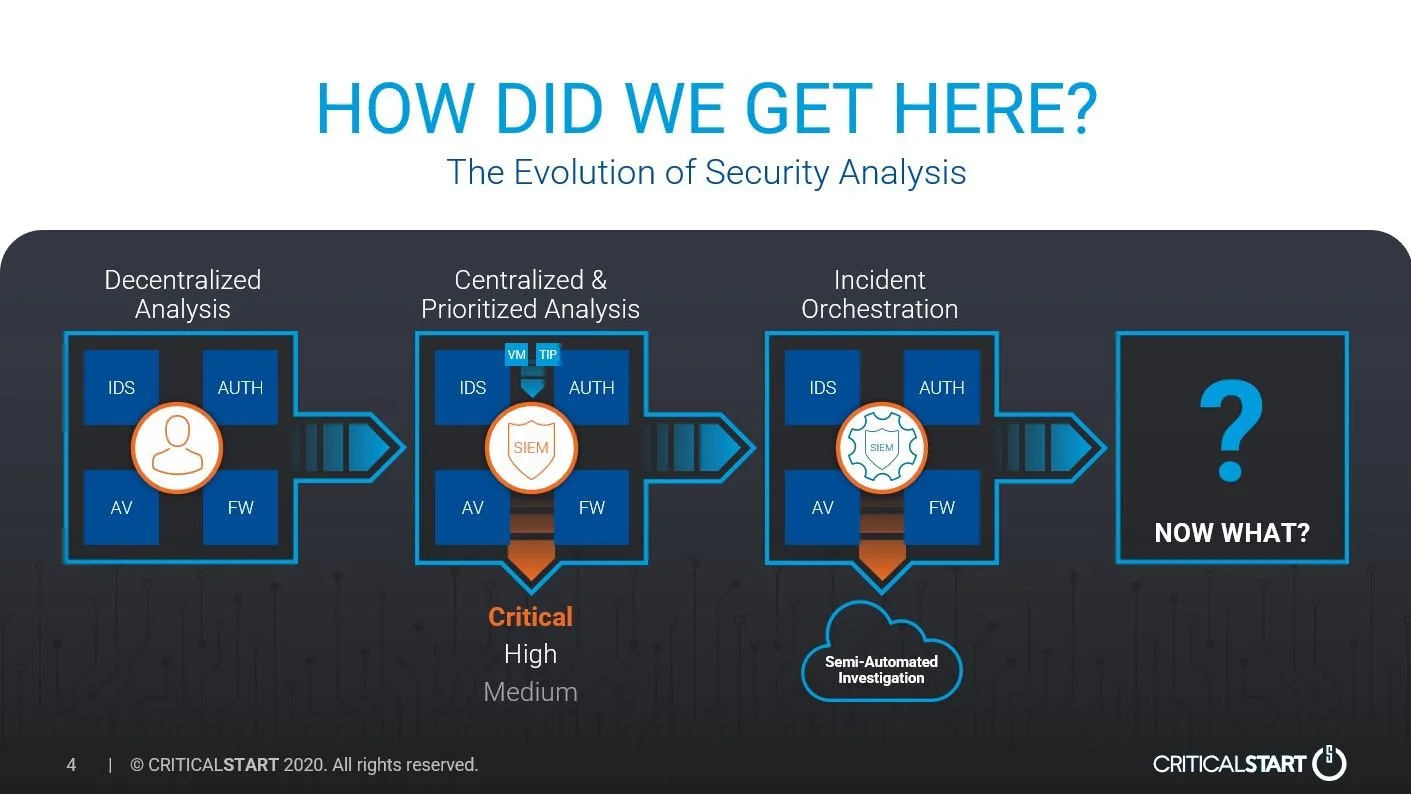 Collaborating closely with the Critical Start team, I integrated the company's branding elements while infusing the presentation with dynamic graphics and sleek typography to create their keynote address. The goal was to captivate the audience's attention with bold colors on a steely gray background to evoke a “darkness” or “danger” during problem statements, only to slowly introduce optimistic white spaces of “clarity” as the speaker progressed through the deck.